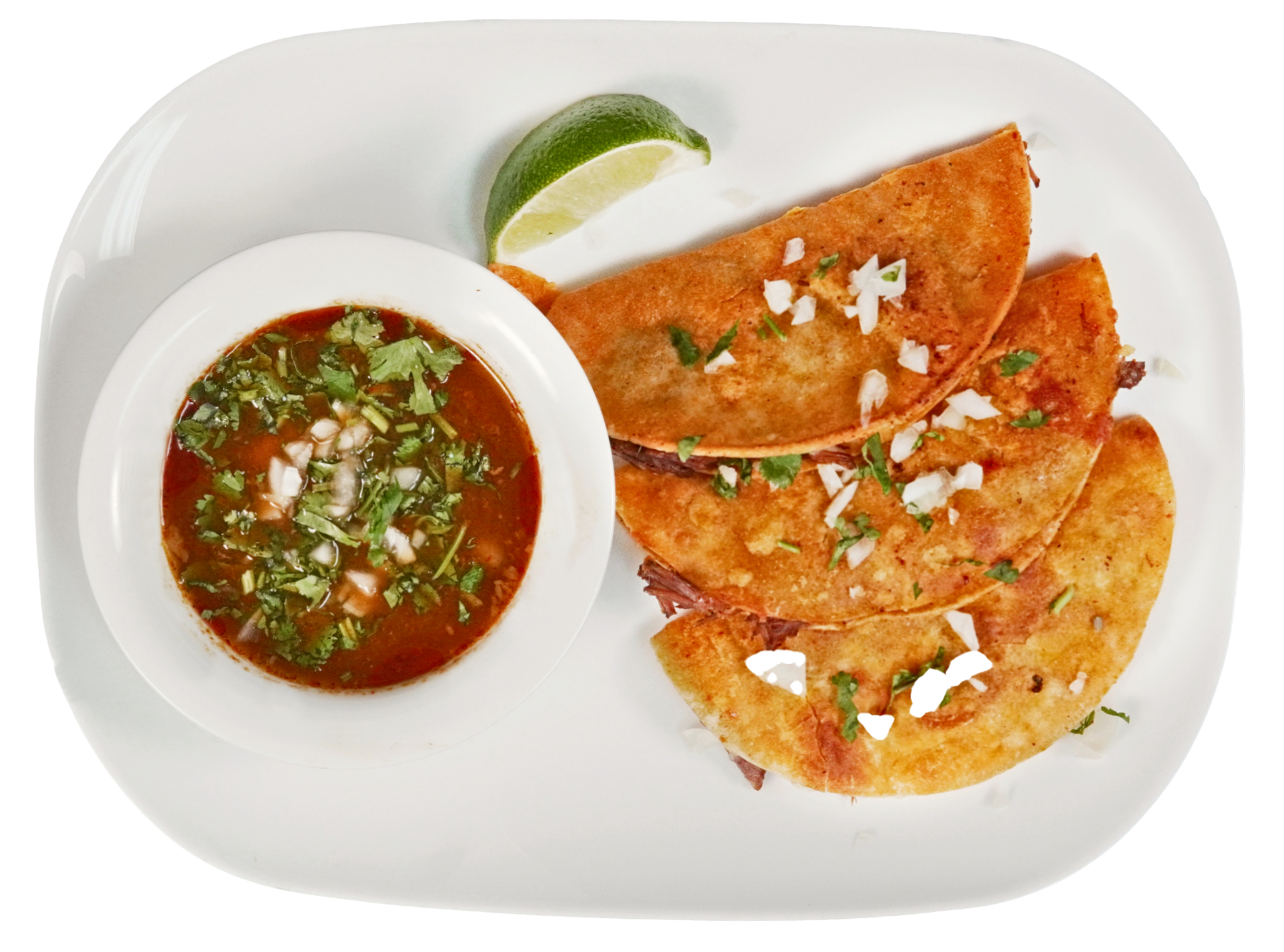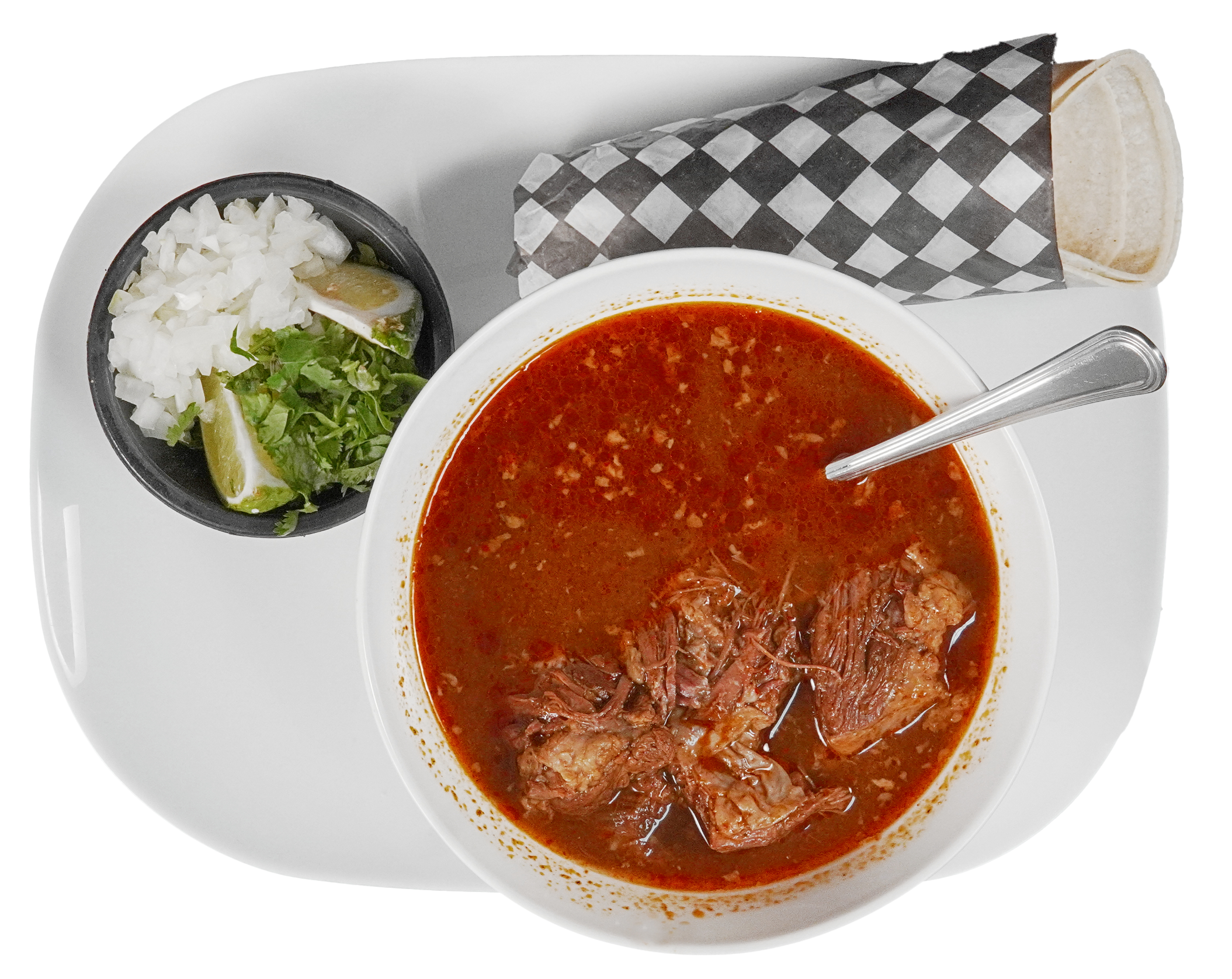 Slow-cooked seasoned beef stew. Garnished with onion, cilantro and lime wedges. Served with three corn tortillas.