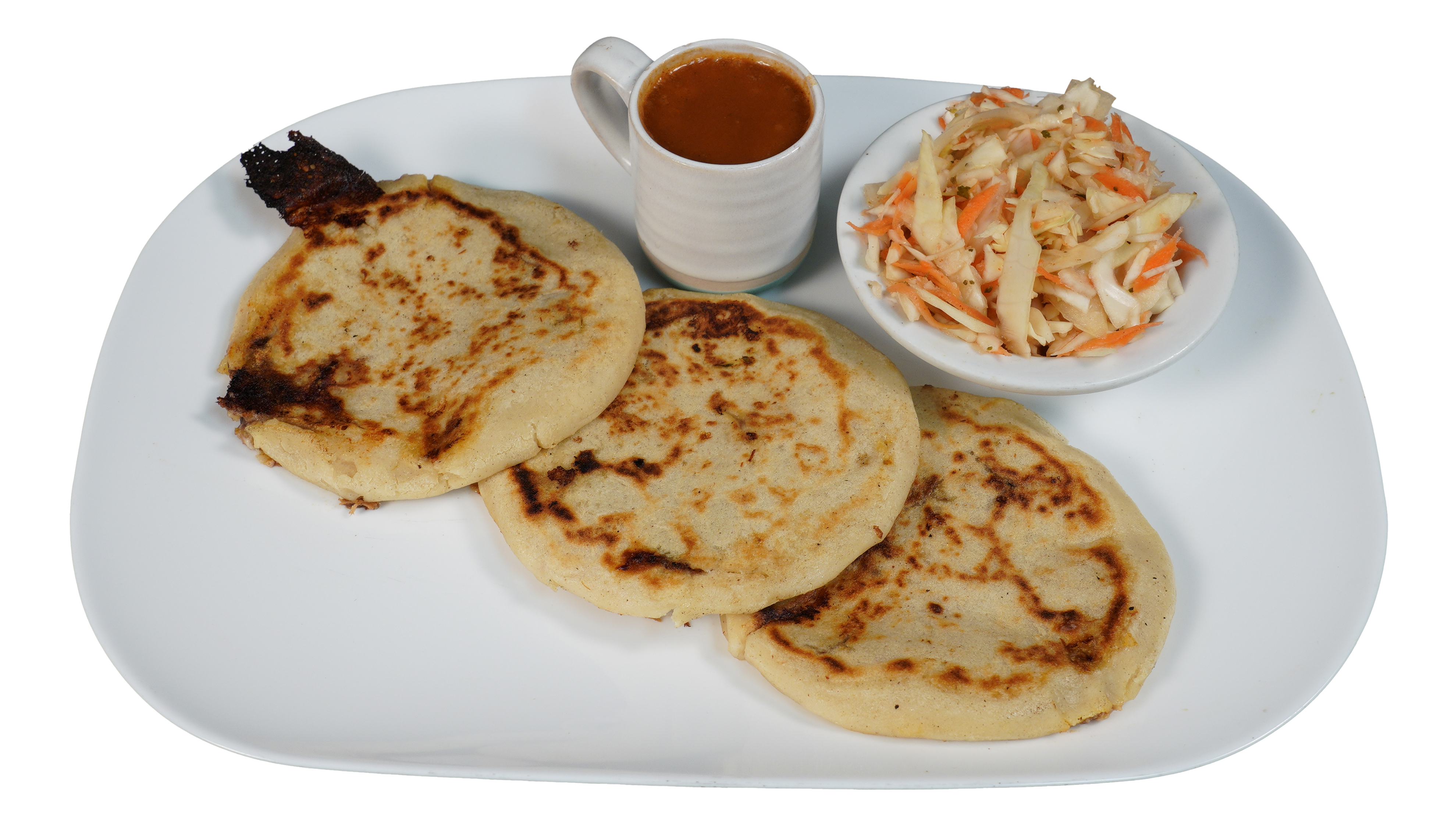 Three deliciously stuffed corn tortillas served with pickled cabbage and red salsa.